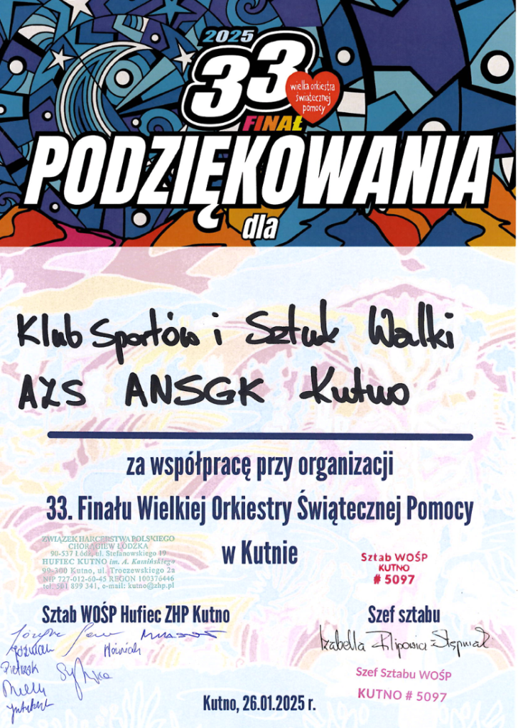 Klub Sportów i Sztuk Walki AZS ANSGK Kutno w ramach współpracy w organizacji 33. Finału Wielkiej Orkiestry Świątecznej Pomocy w Kutnie zaprosił na specjalny trening Taekwondo, podczas którego można było wesprzeć Orkiestrę wrzucając dobrowolną kwotę do puszki obecnych tam wolontariuszy WOŚP.